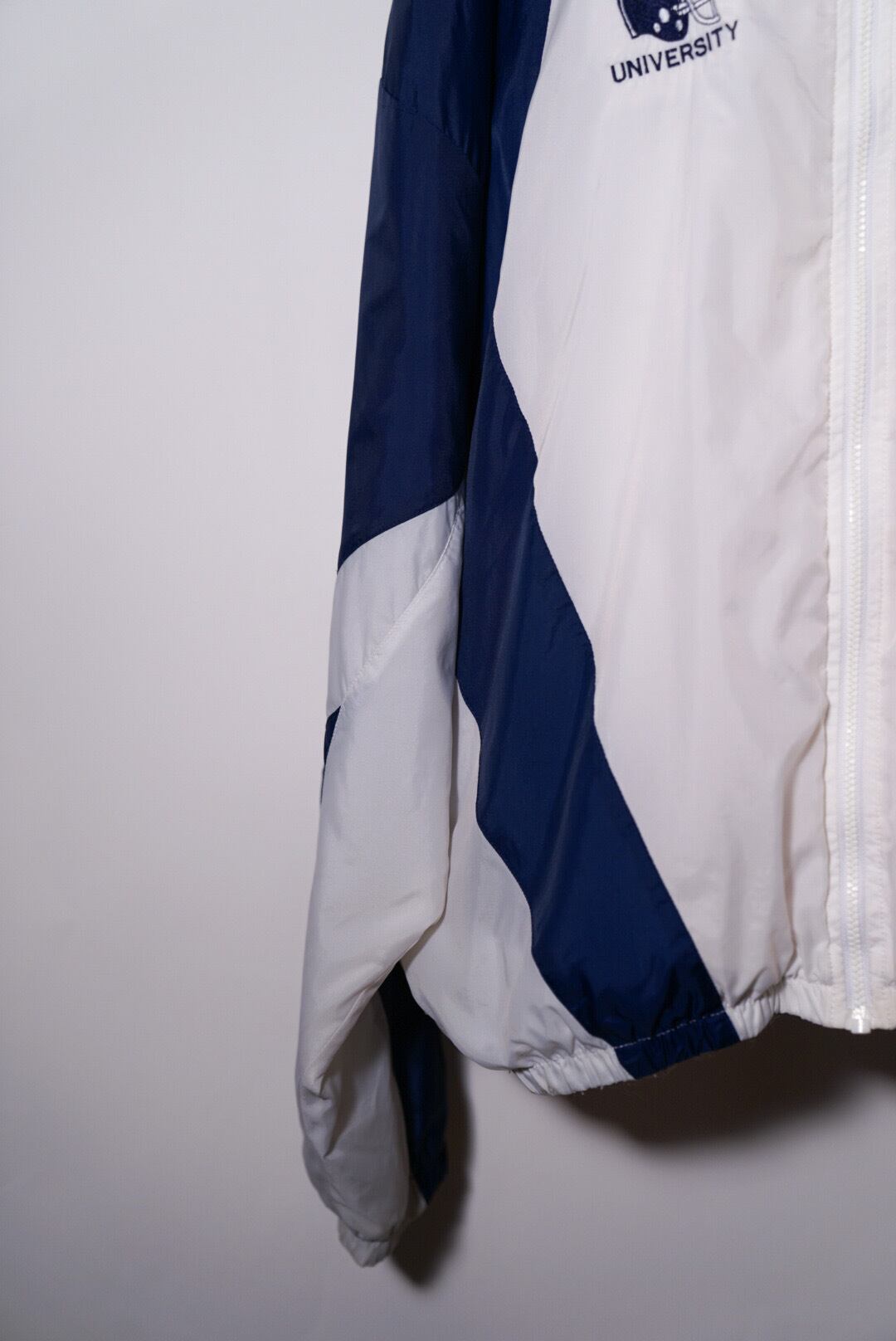 濃いブルーとホワイトのカラーリングで、胸元には刺繍のロゴと大学のアメフトチーム?の刺繍。