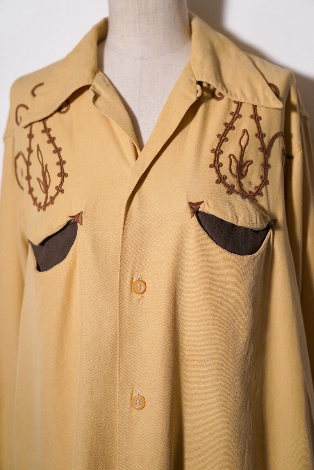 ウエスタン調のデザインですが、スナップボタンではなく普通のボタンになっていて、さらにオープンカラー