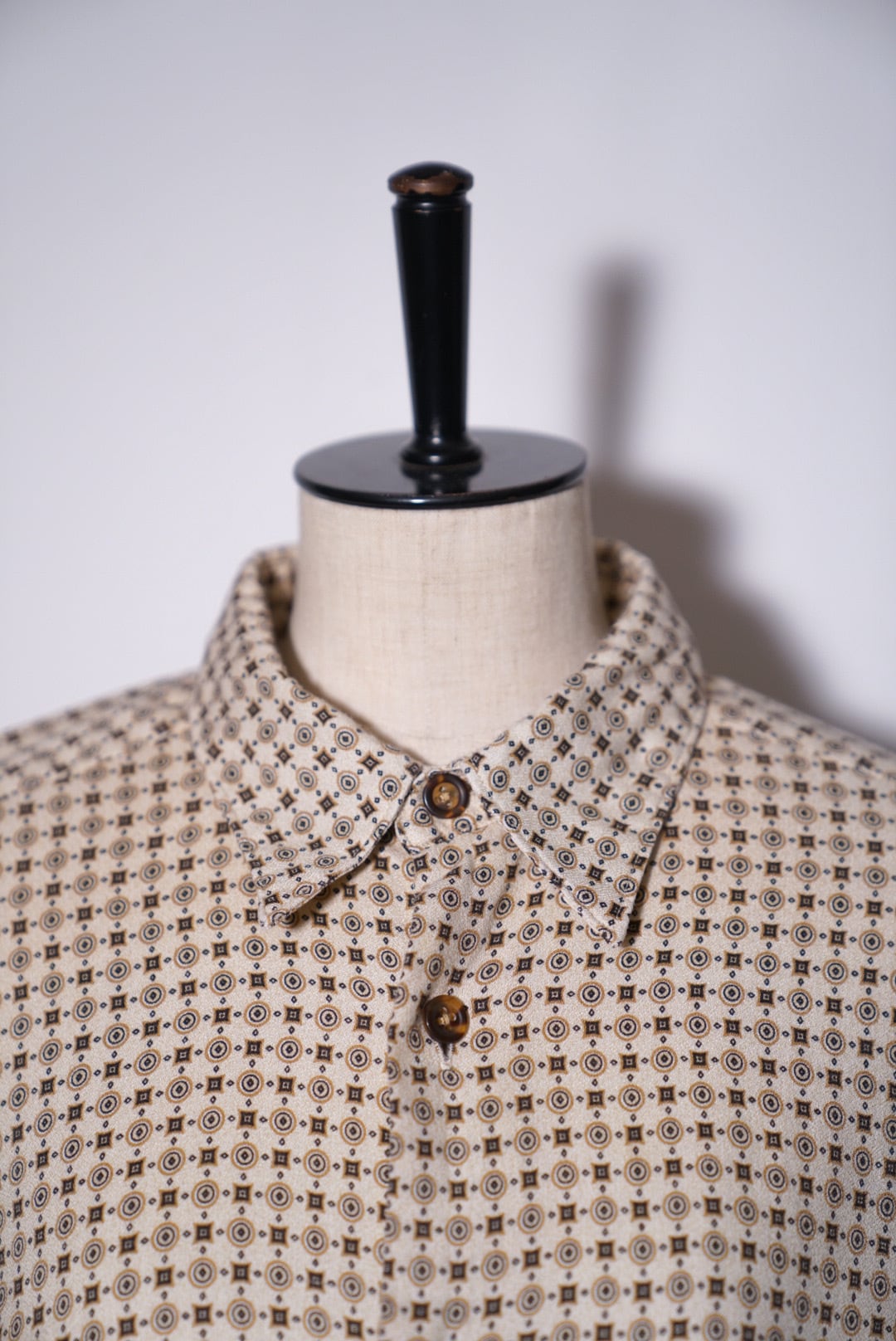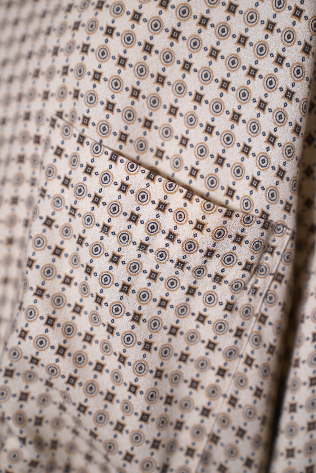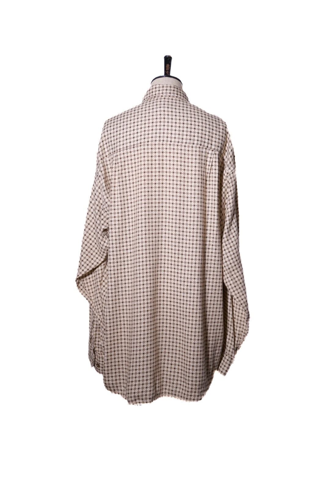 生成りボディに落ち着いたトーンの柄がバランスよく、重くならず軽く羽織れるシャツです。