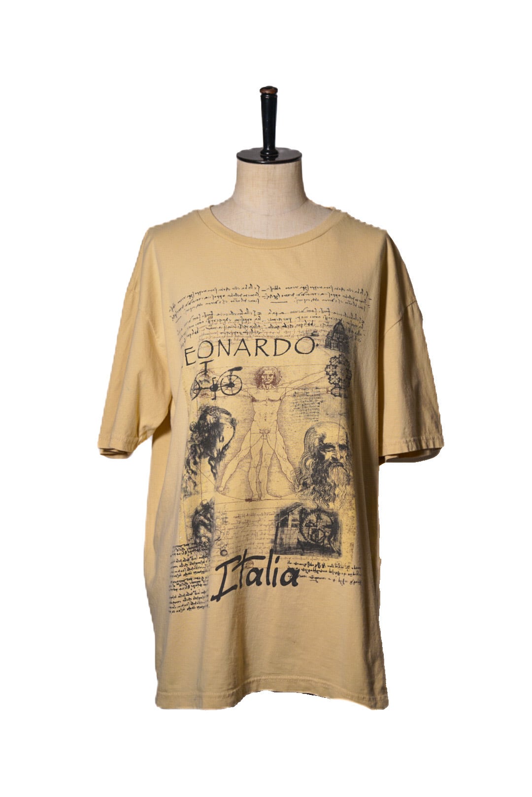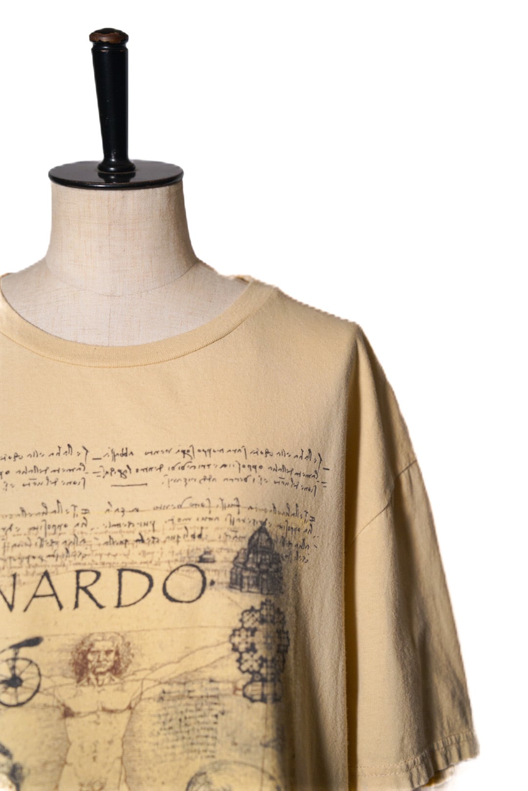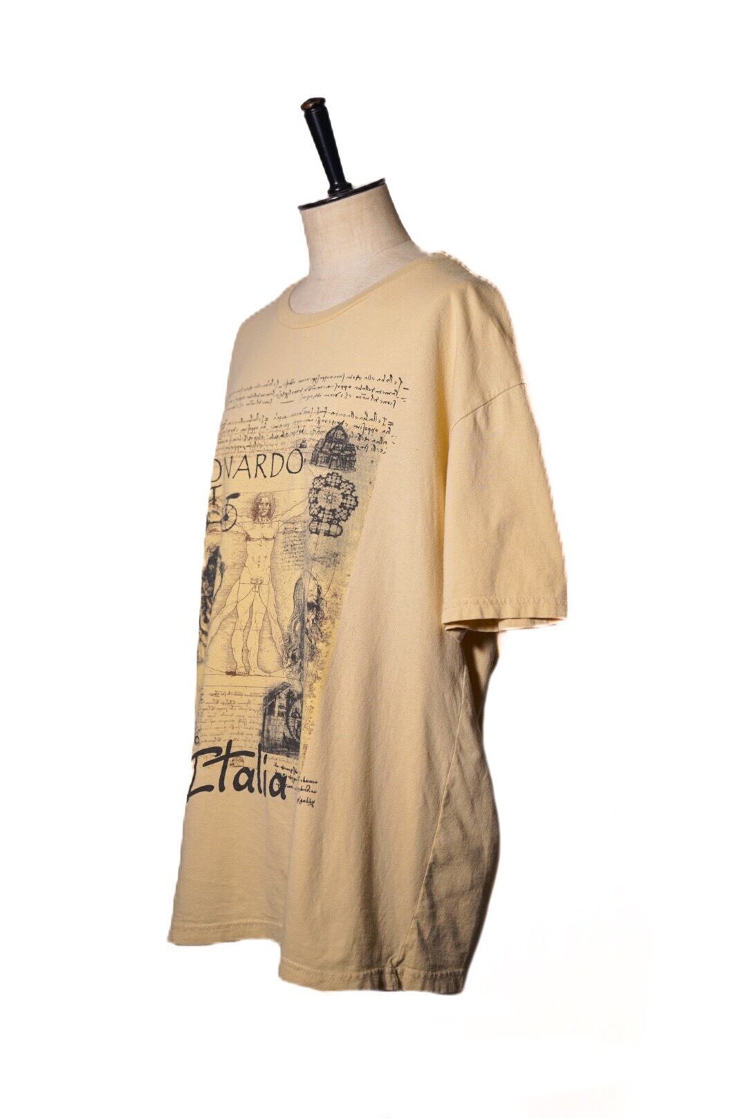 レオナルド・ダヴィンチが描いたドローイングや自画像などが所狭しとフロントにプリントされている迫力のあるTシャツ。