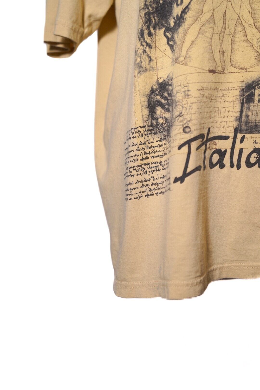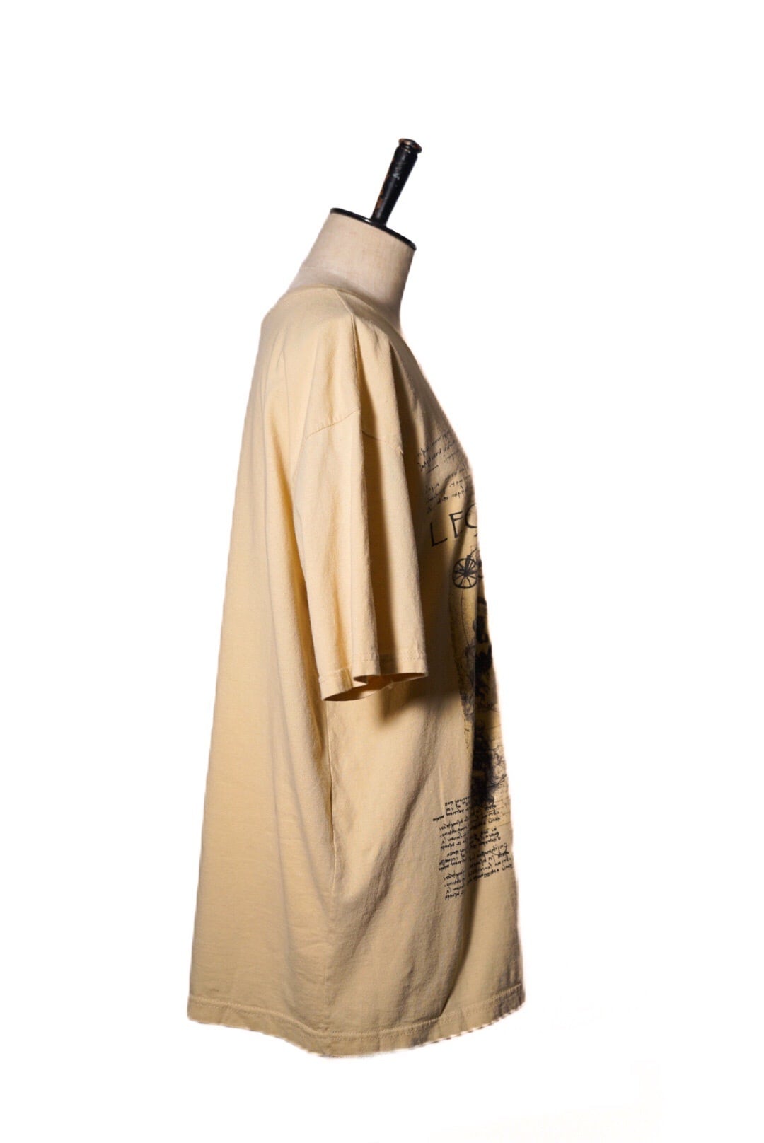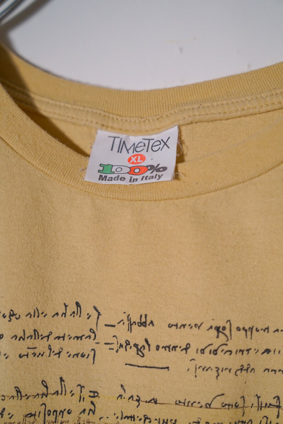レオナルド・ダヴィンチが描いたドローイングや自画像などが所狭しとフロントにプリントされている迫力のあるTシャツ。
