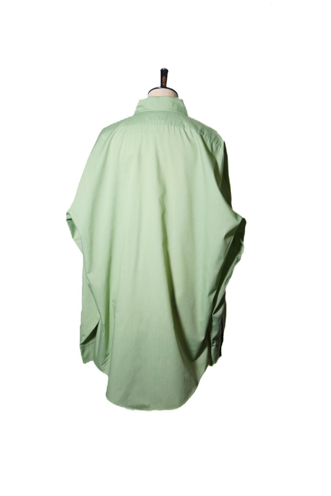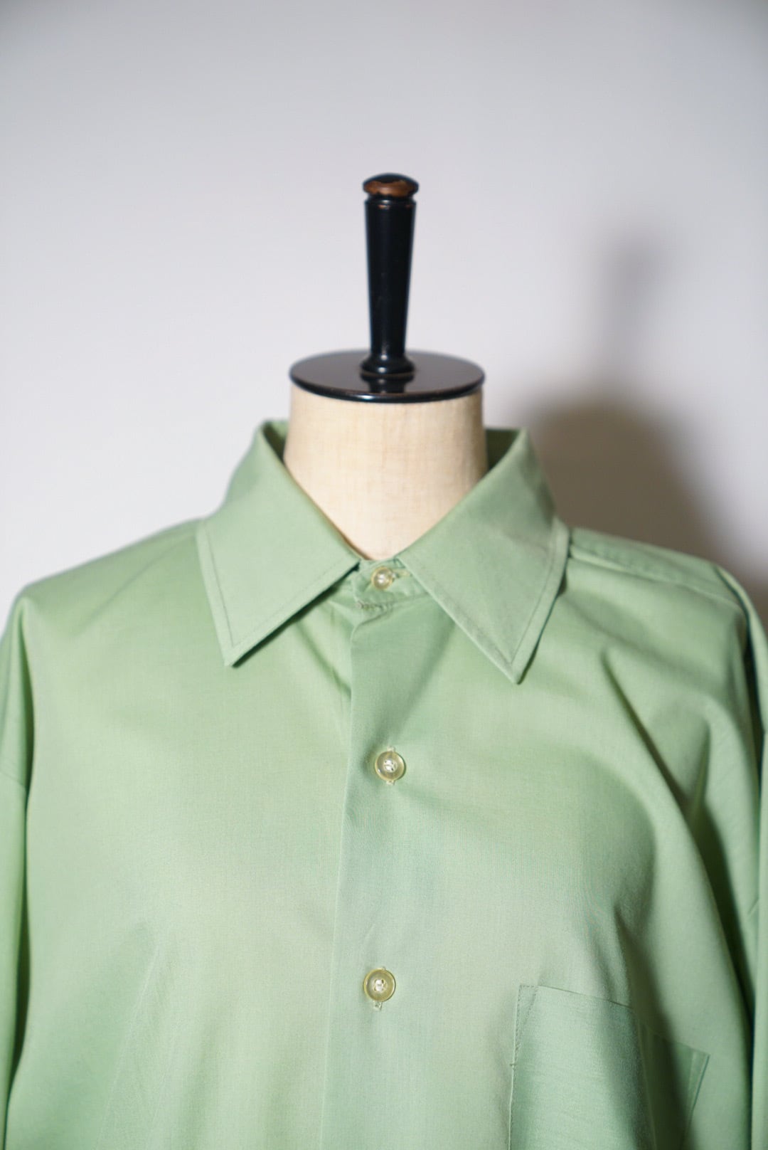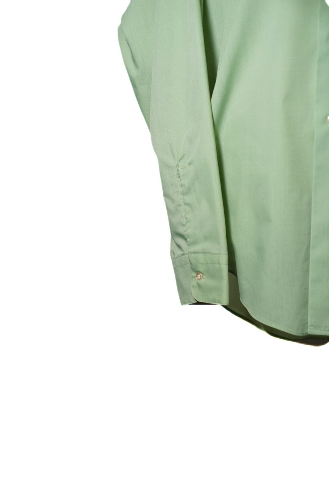 淡いミントグリーンのトーンは、無地ながら十分に存在感をもつ色合い。ポリエステル特有の控えめな光沢が、シャツの軽やかさを引き立てています。
