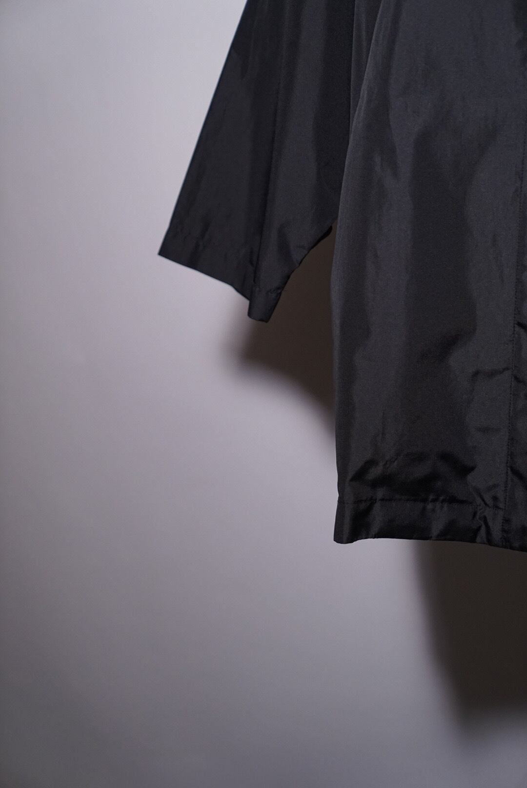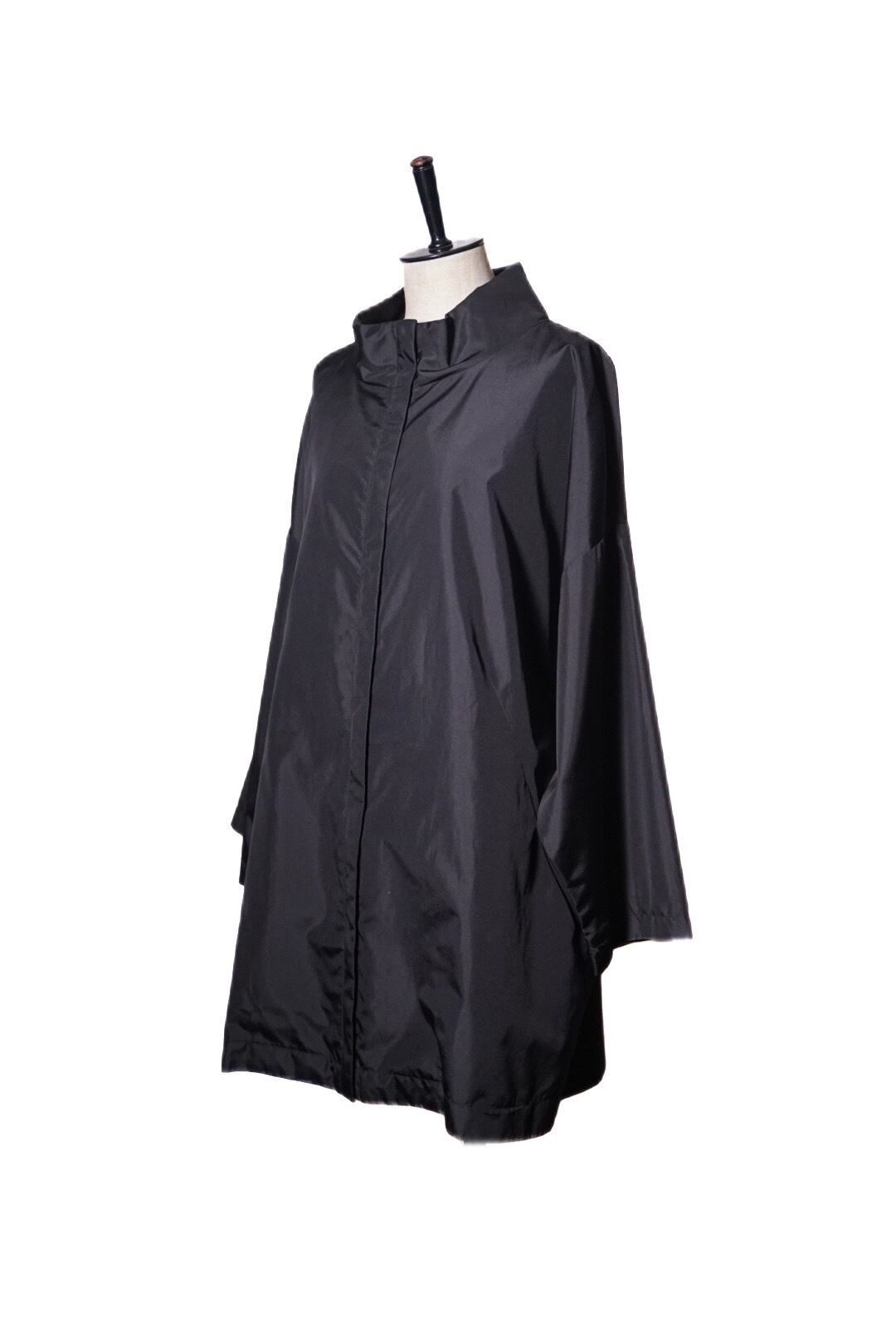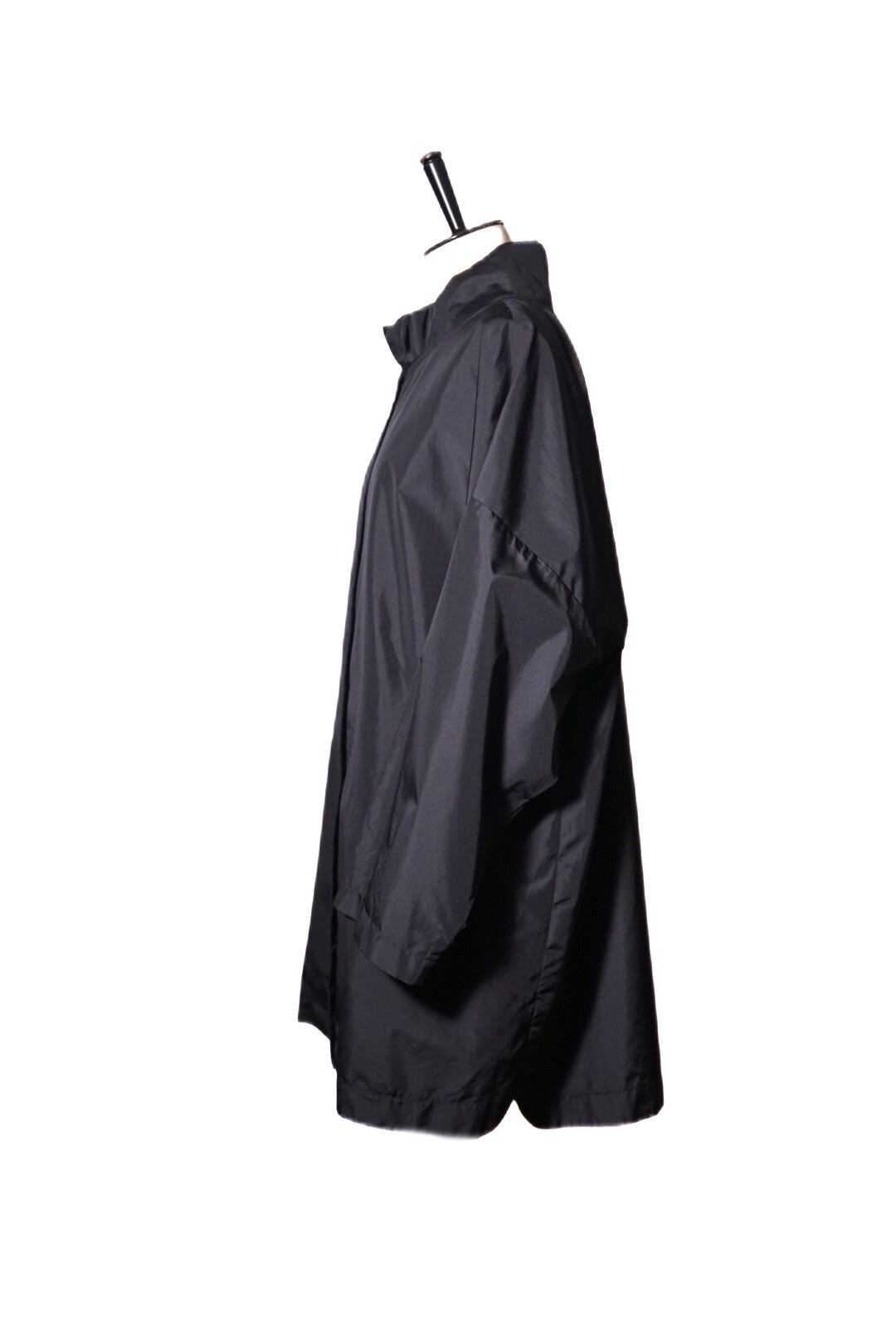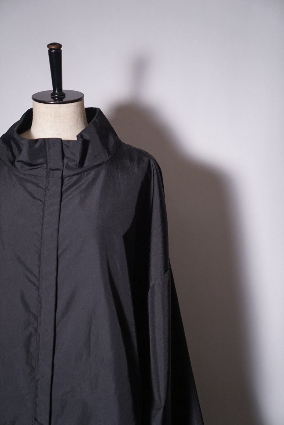 比翼仕立てのフロントと立ち上がるスタンドカラーが、シンプルながらもモードな雰囲気を引き立てます。