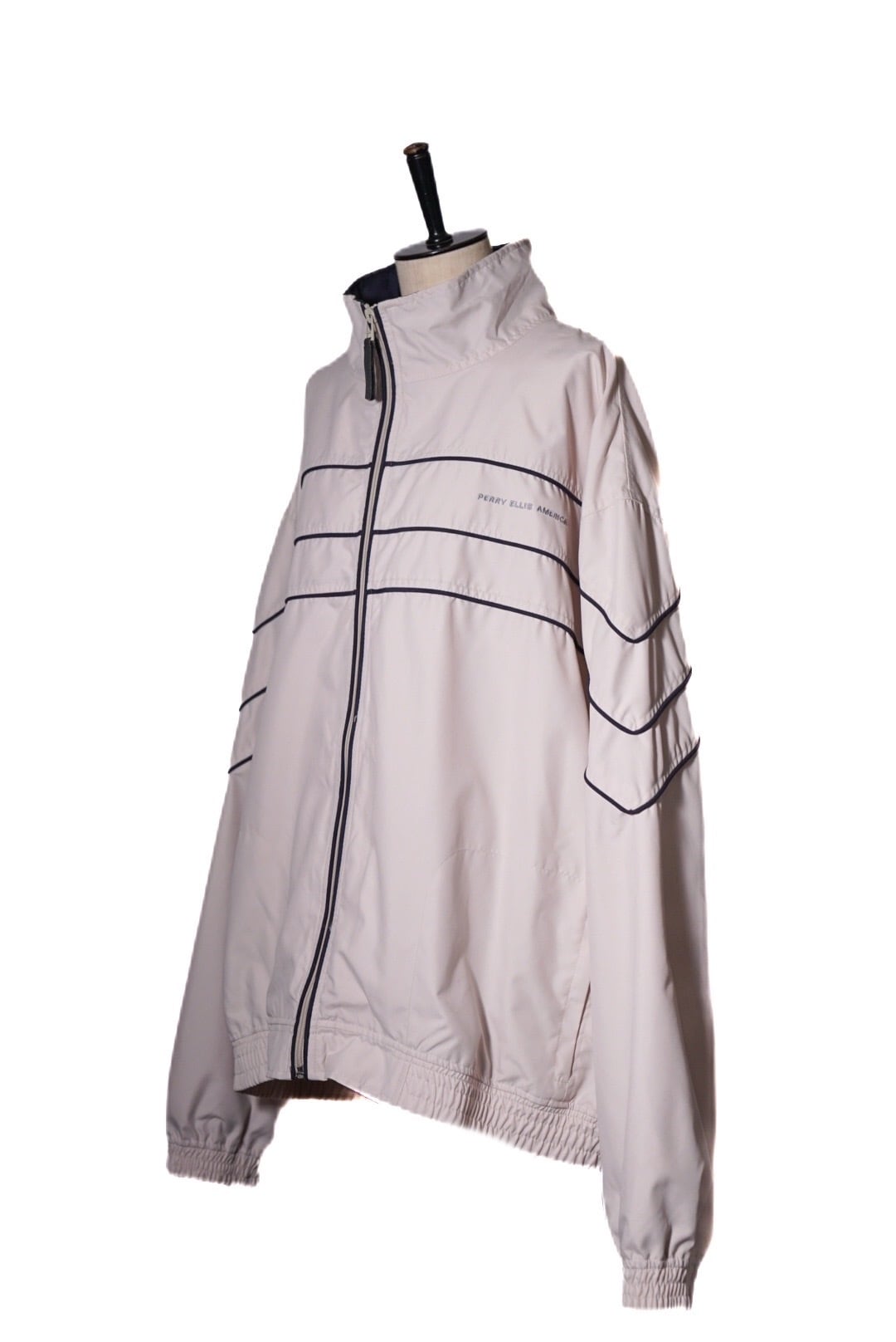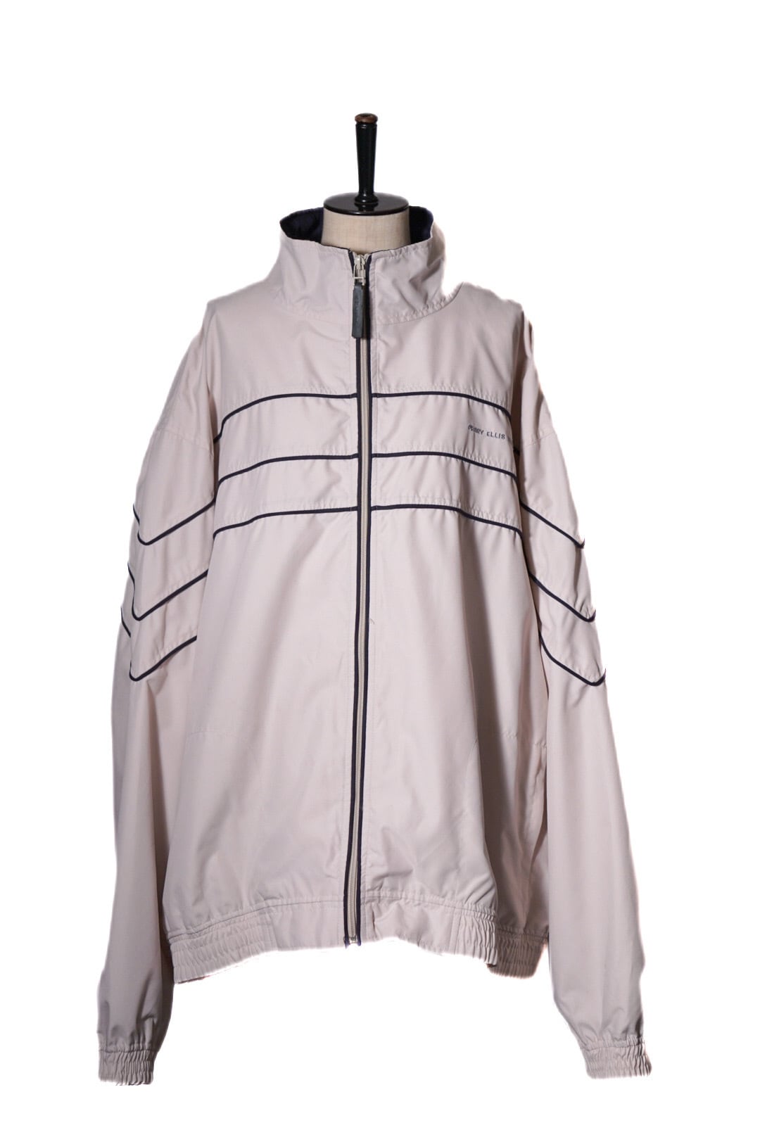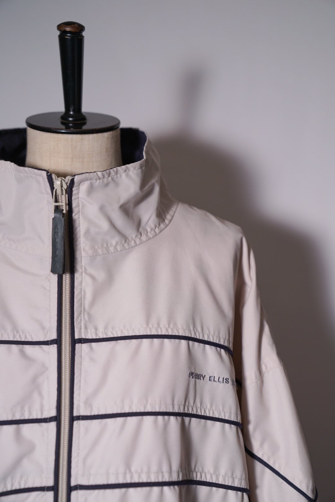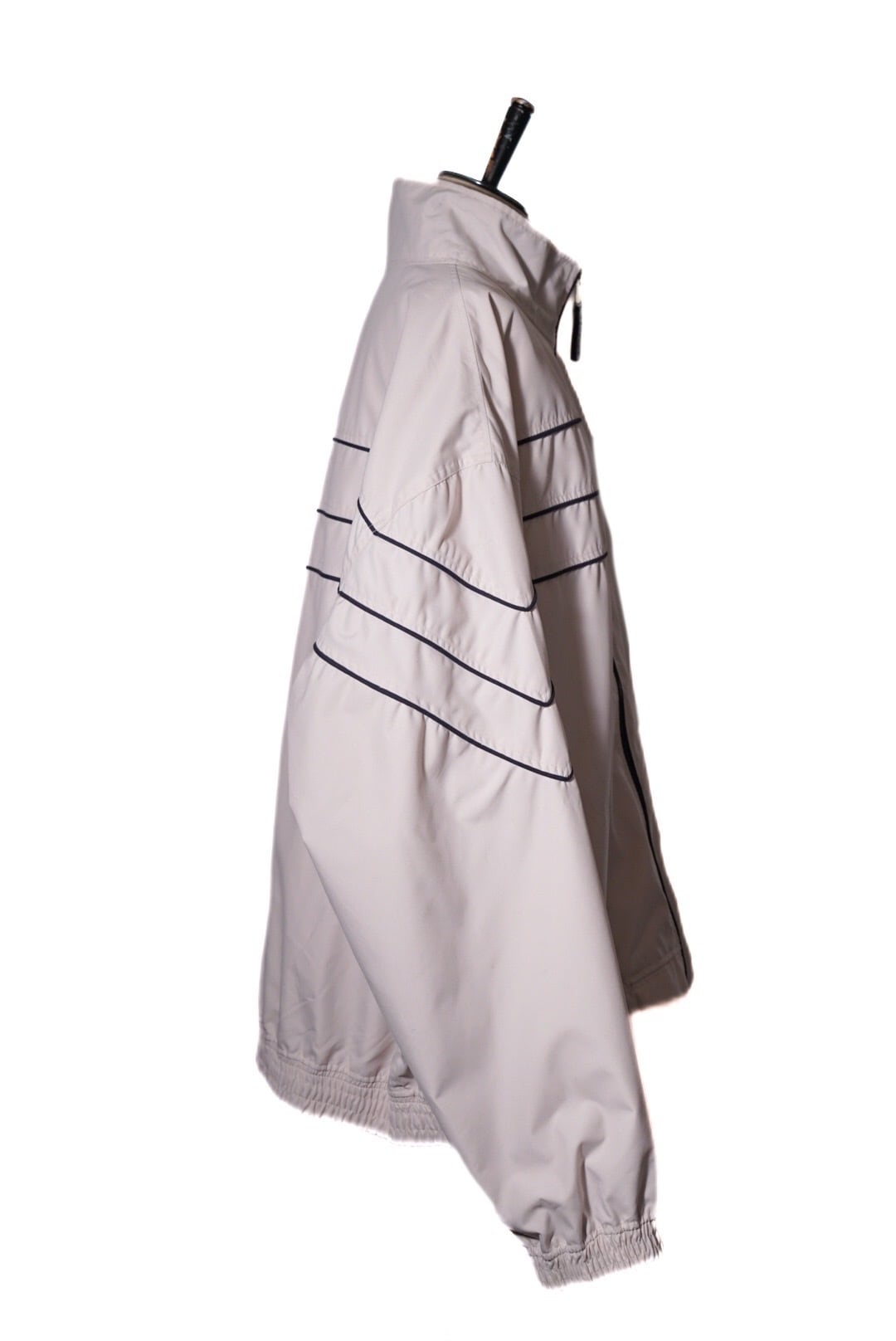 マッドな生地感のオフホワイトカラー、そしてネイビーのライン。