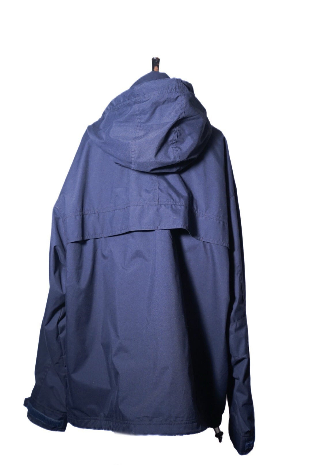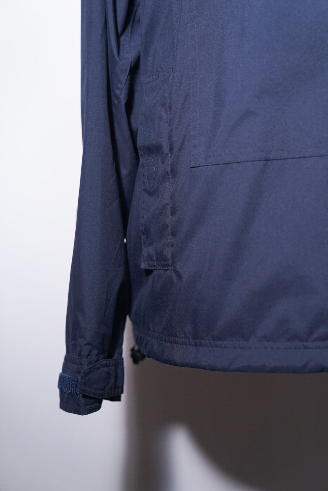 暗めのネイビーのカラーに多くのポケットが付き、ハイネック、裾にはドローコード。