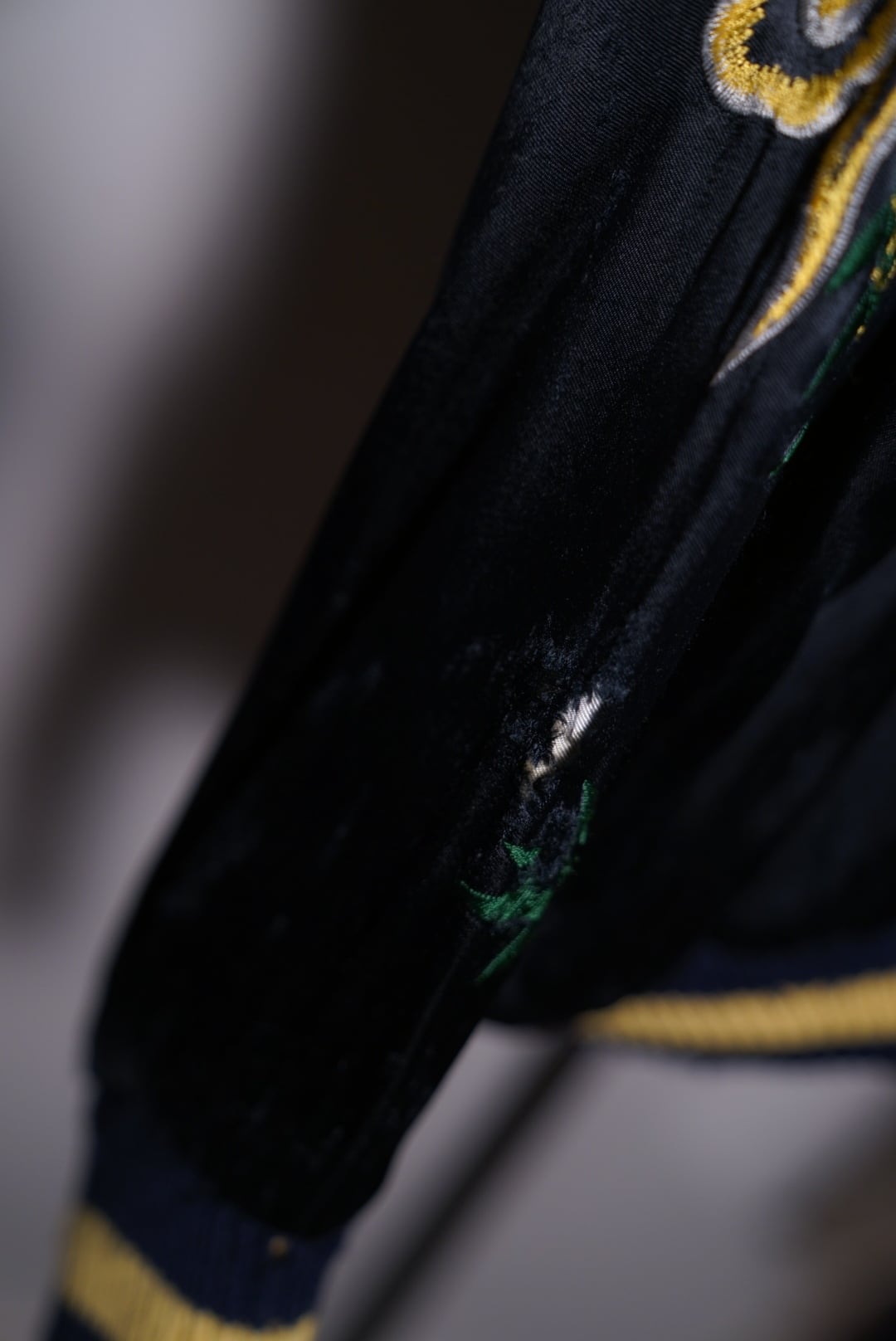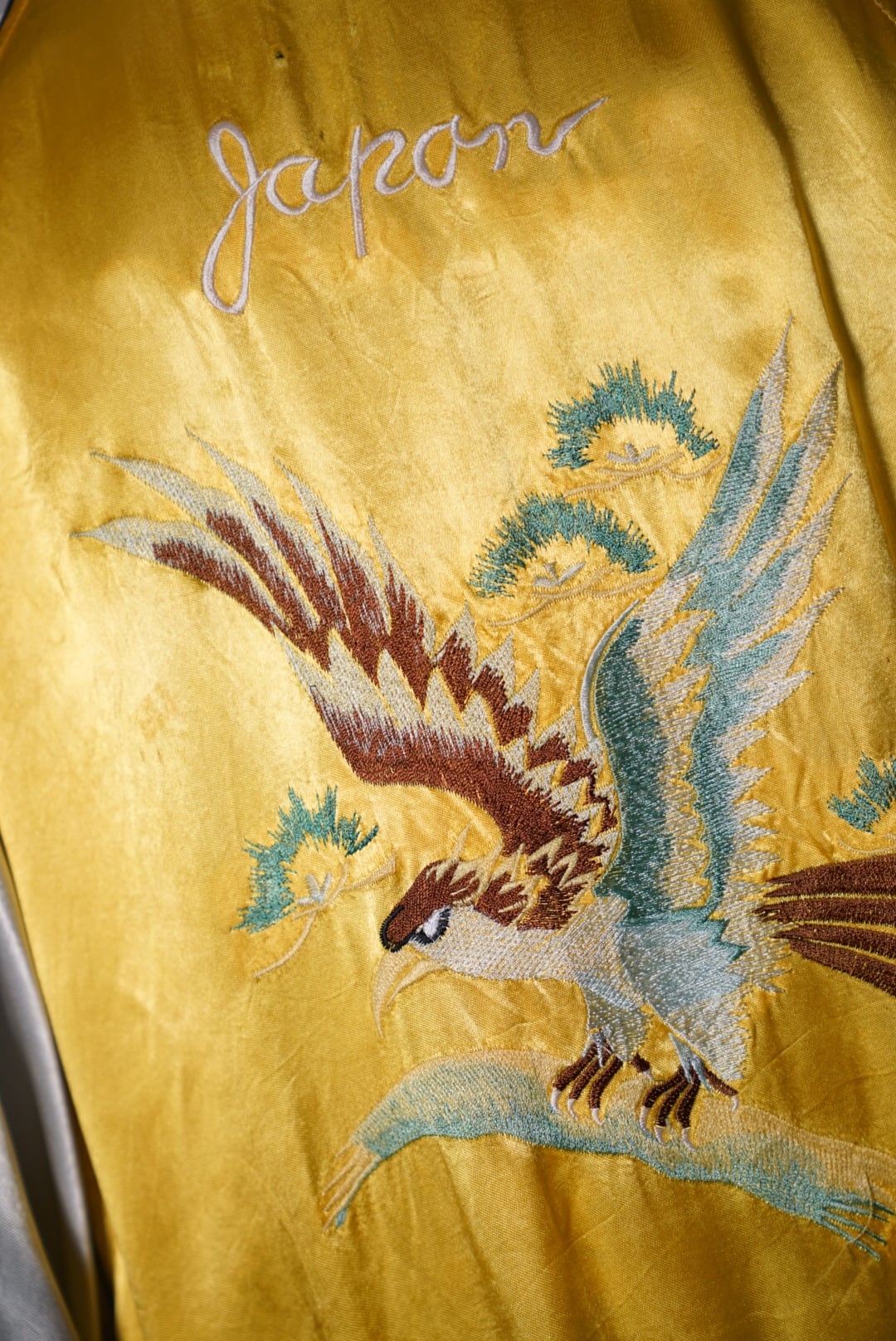 表はブラックベースに虎の刺繍、裏はゴールドボディに鷹の刺繍と "Japan" の文字。