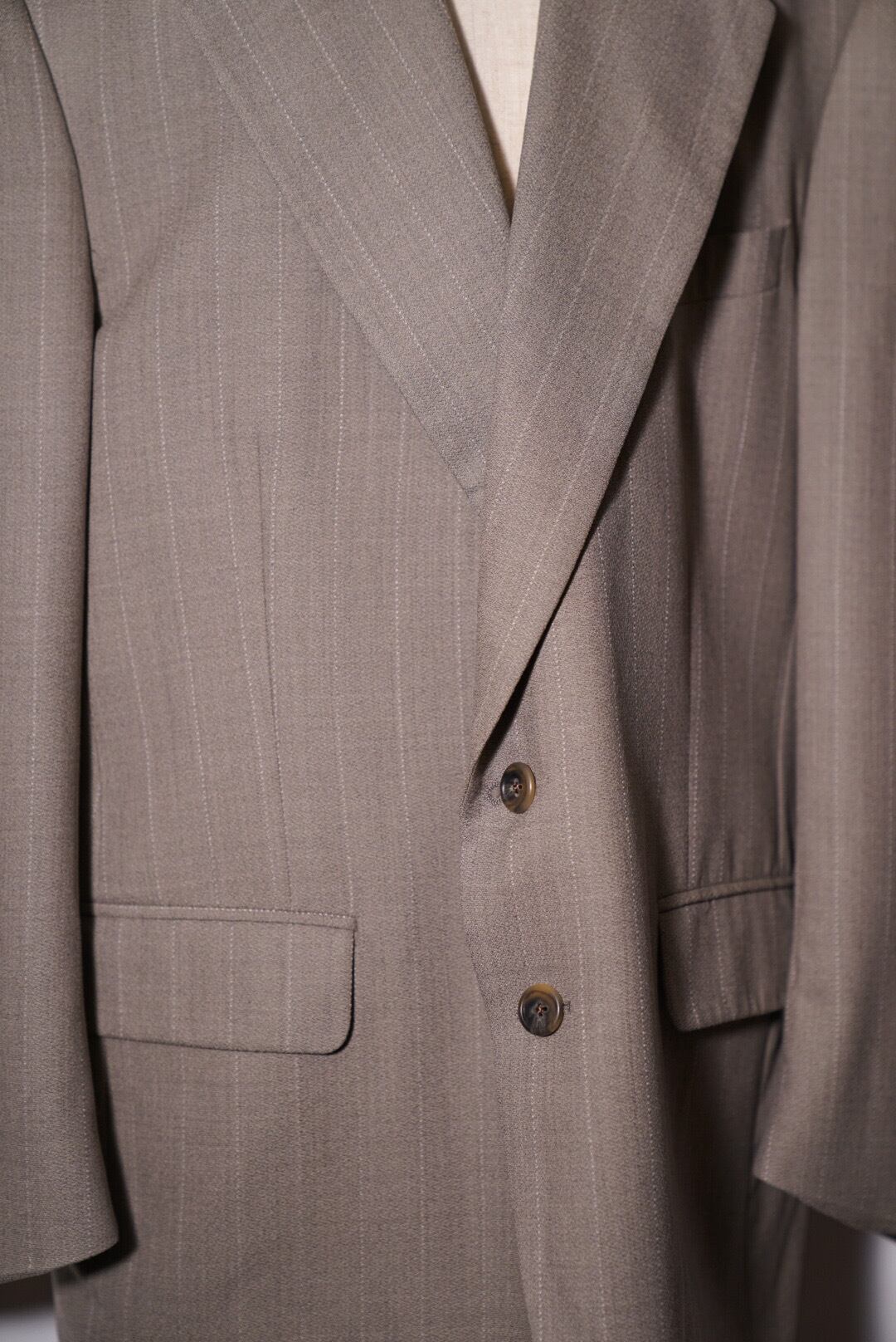 ボディのアッシュグレーにうっすらと入る白のストライプが上品なテーラードジャケットです。