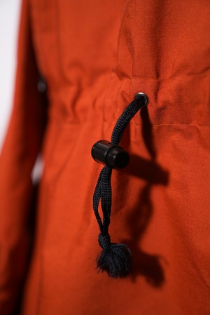 へそ上くらいの位置に涙タロンジッパーのポケットが3つ密集していて、そのすぐ下の腰あたりにドローコードが剥き出しになっています。