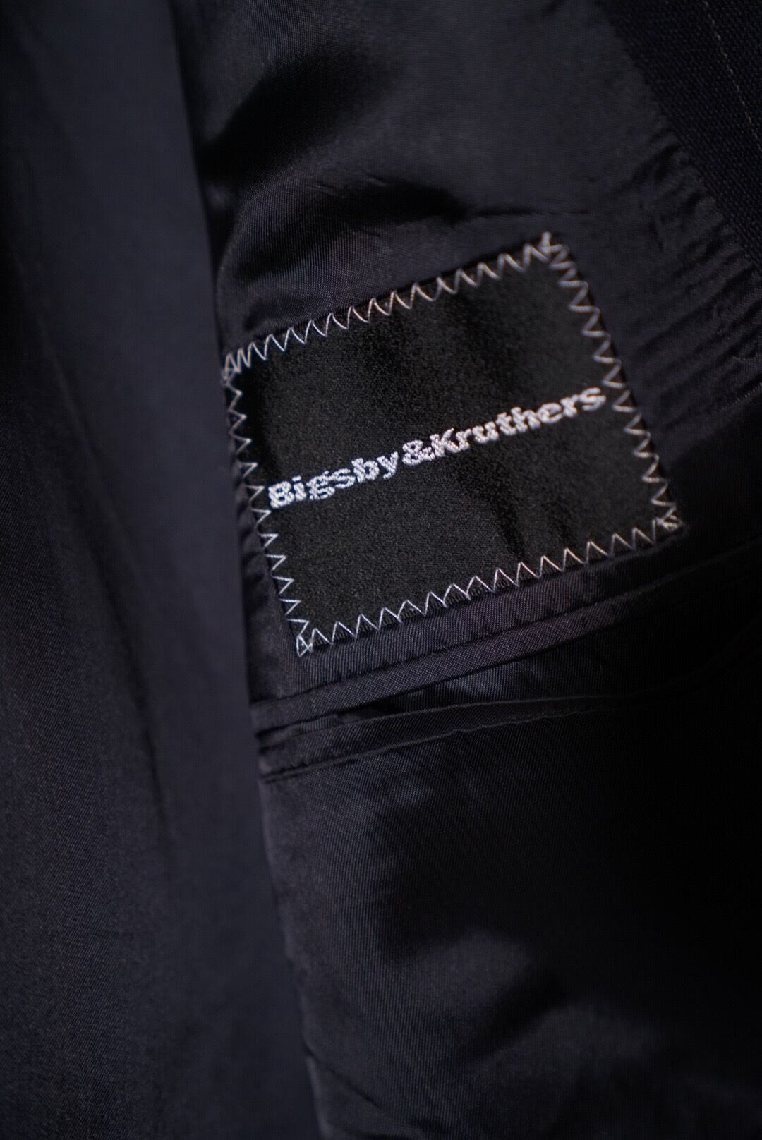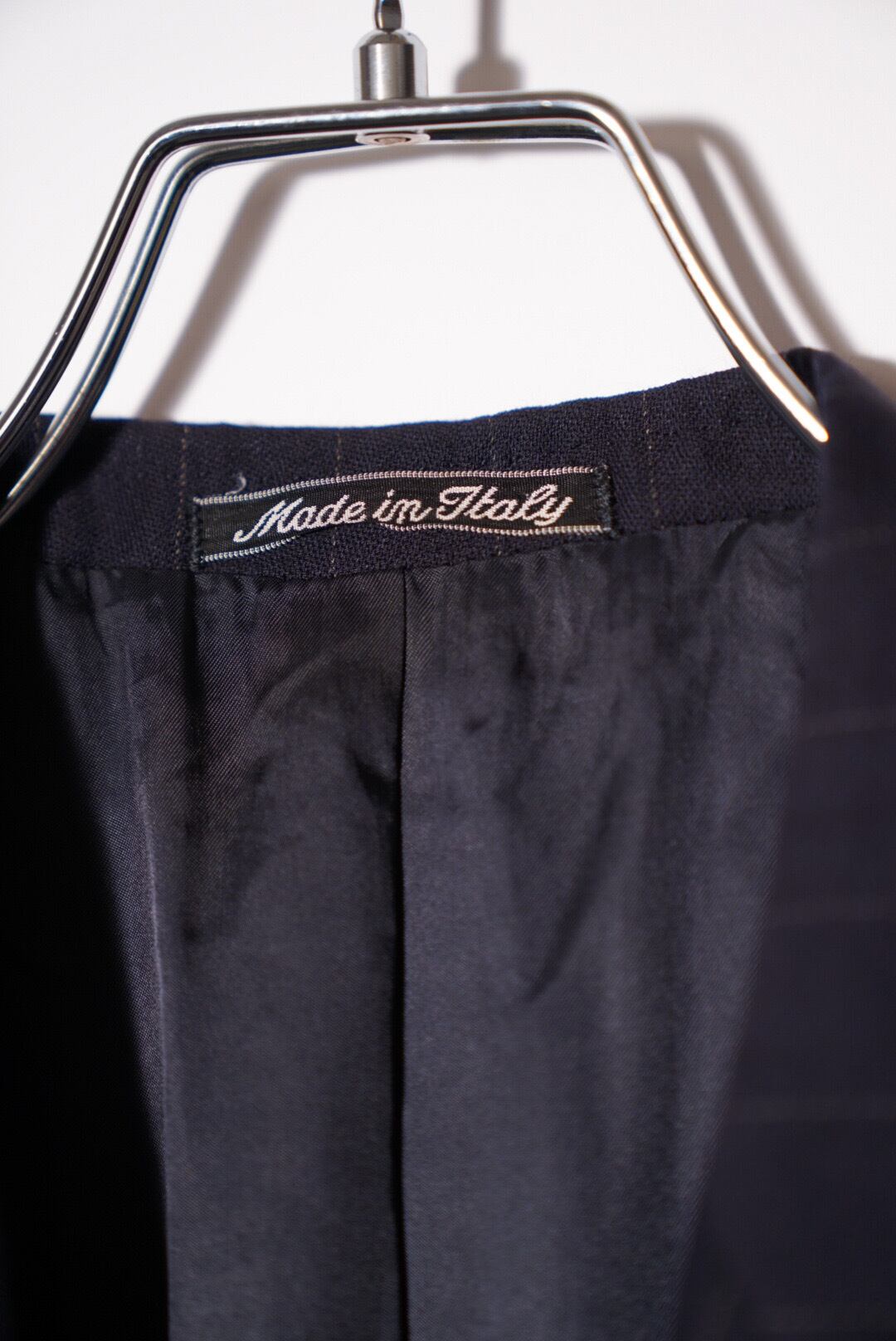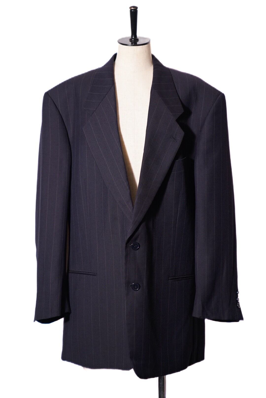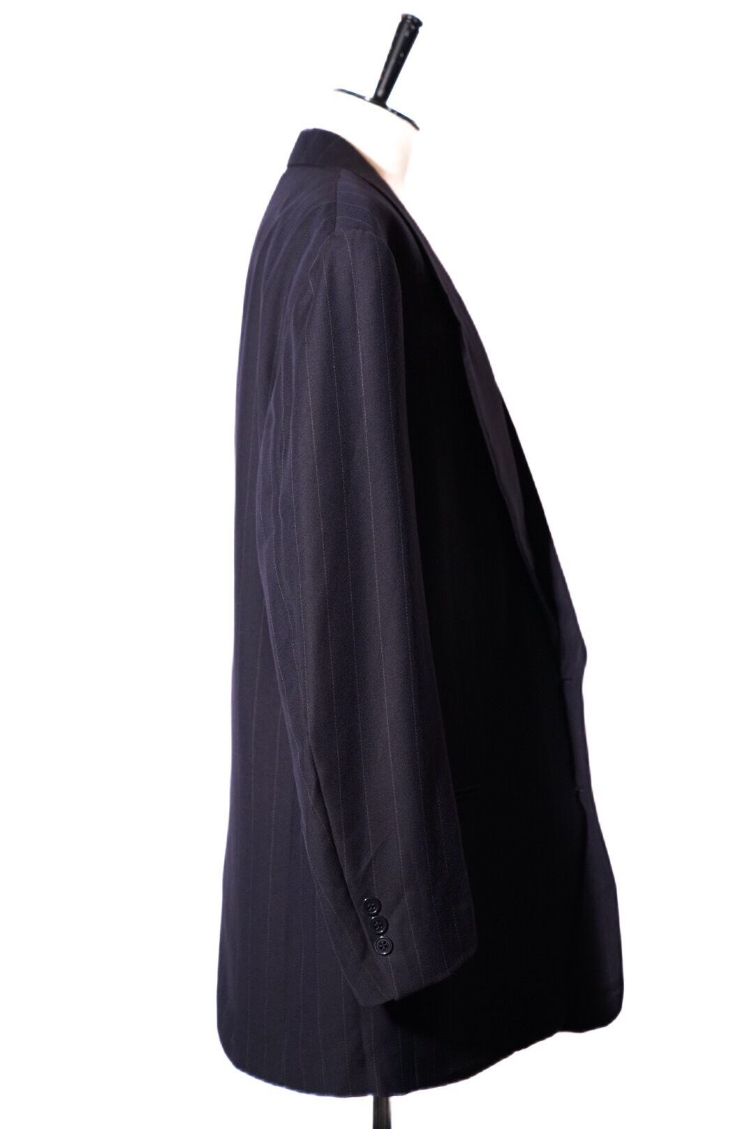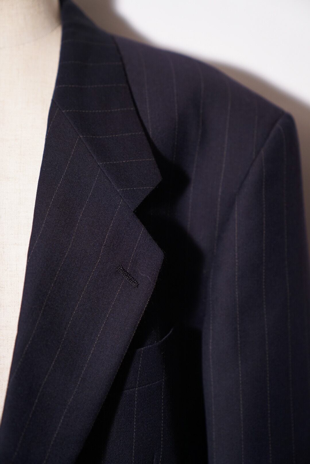 ミッドナイトネイビーにかすりのホワイトのストライプ、肩パッドが入りつつも迫力が出過ぎないパターン、身幅も太過ぎず着丈も丁度いい。