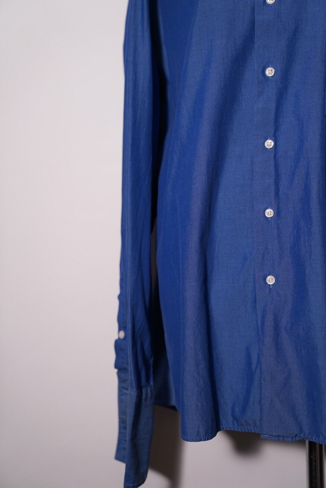 こちら袖部分にボタンがなく、カフスボタンを自ら付けていただくシャツです。