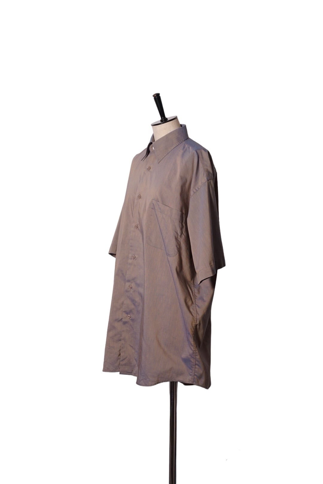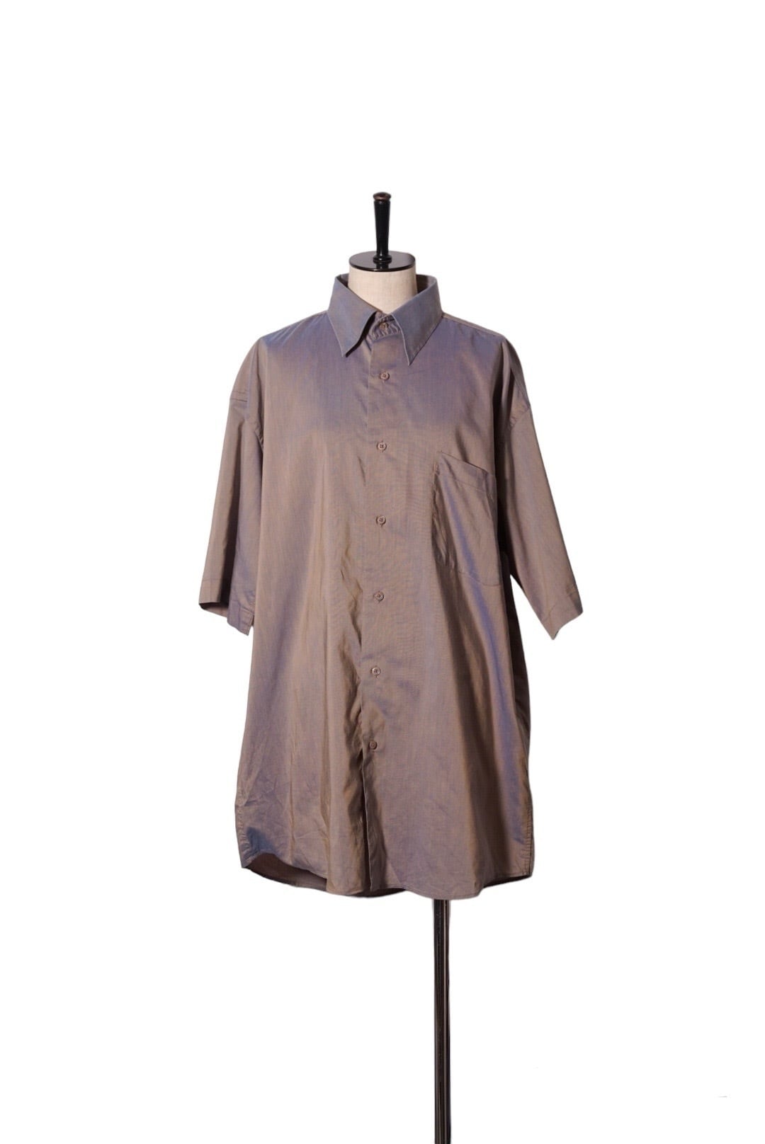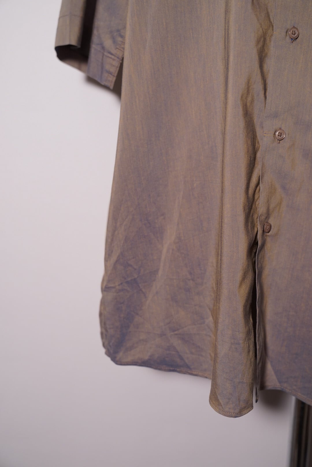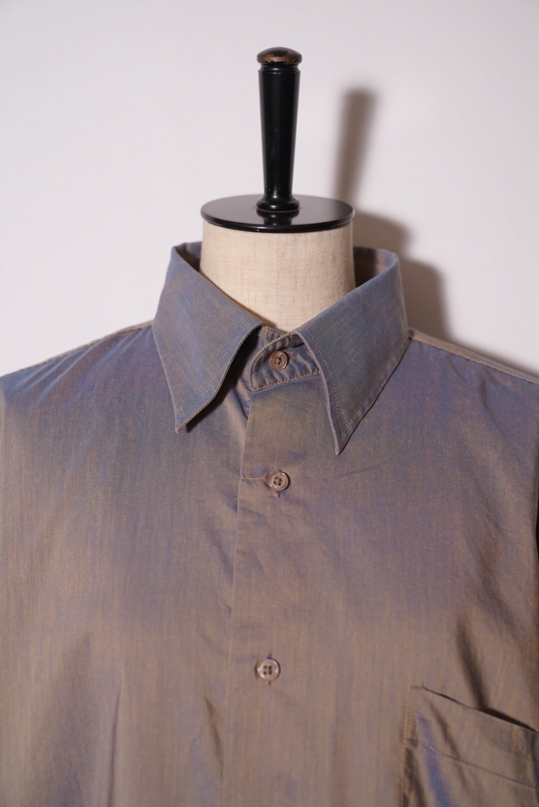 光沢感のあるグレーに近い色の、タマムシ色のシャツです。縦糸と横色をブルーグレーと黄色の糸で構成しており、光の当たり方で見え方が変わります。