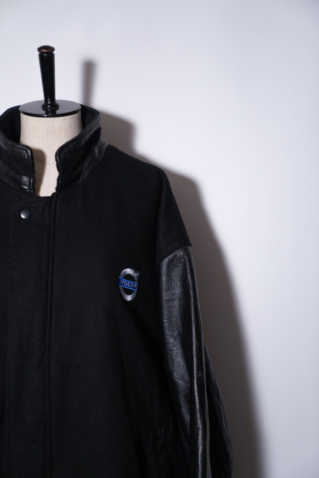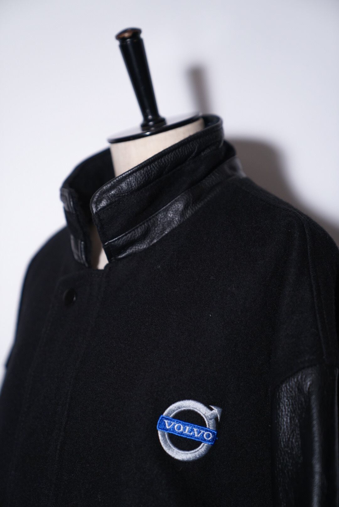 ボンバータイプのルーズなジャケットで袖がレザー切替だけでも良いのに、胸にワンポイントVOLVOです。