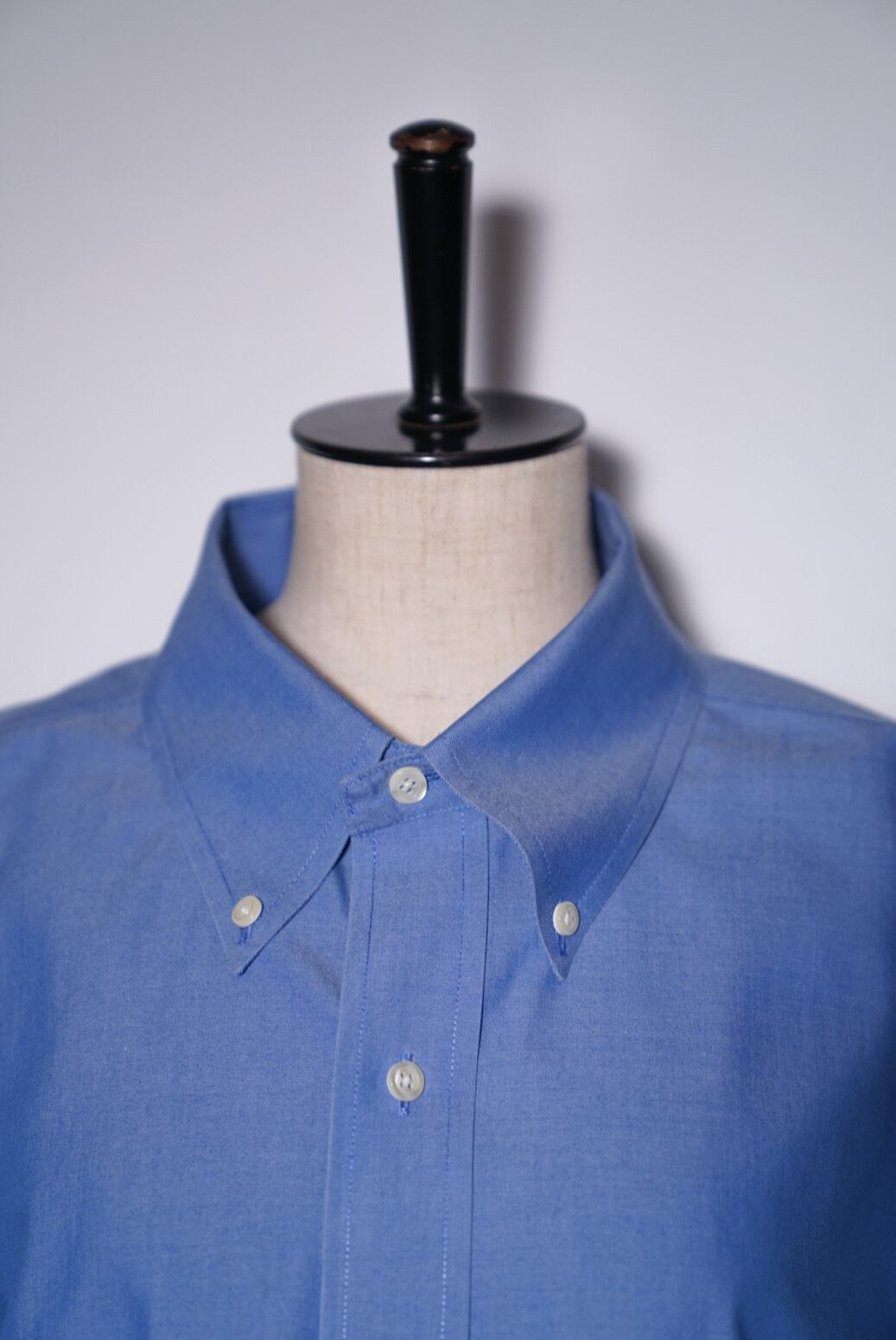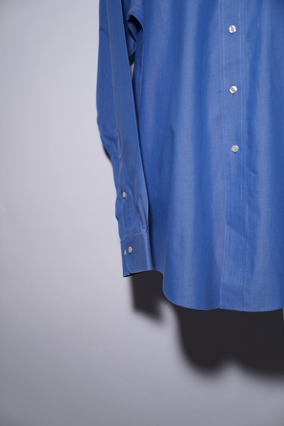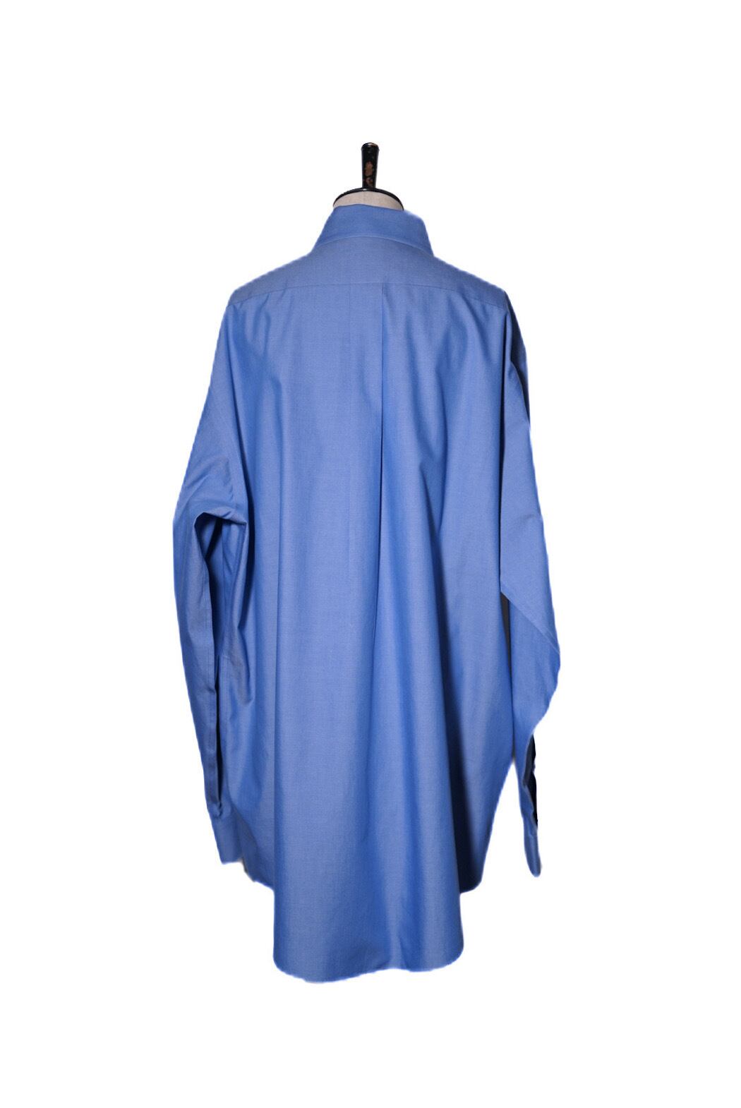 ブルーの無地でどんなコーディネートにも合わせやすくもありながら、玉虫色の上品な光沢感が普通のシャツとは一線を画す良い存在感。